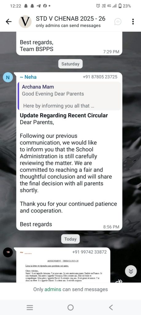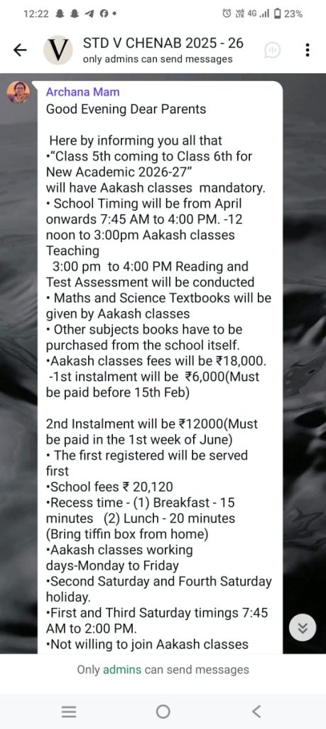 અંગ્રેજીમાં પાઠવાયેલ આ મેસેજમાં નવા શૈક્ષણિક વર્ષ 2026-27 માટે ધોરણ 6ના બાળકો આકાશ ક્લાસિસ ફરજિયાત કરાયાના ઉલ્લેખ સાથે શાળાનો સમય એપ્રિલથી સવારે 07:45 થી સાંજે 04:00 વાગ્યા સુધી કરાયો છે. ગણિત અને વિજ્ઞાન પાઠ્યપુસ્તકો આકાશ ક્લાસીસ દ્વારા પૂરા પાડવામાં આવશે જ્યારે અન્ય વિષયોના પુસ્તકો શાળામાંથી જ ખરીદવાનું જણાવાયું છે. વધુમાં આકાશ ક્લાસિસની ફી રૂ.18,000 રાખી પહેલો હપ્તો રૂ.6,000 નો ભરવા જણાવાયું છે. જે પણ 15 ફેબ્રુઆરી પહેલા જ્યારે બીજો હપ્તો રૂ.12000નો જૂનના પહેલા અઠવાડિયામાં ચૂકવવાનો આદેશ કરાયો છે.