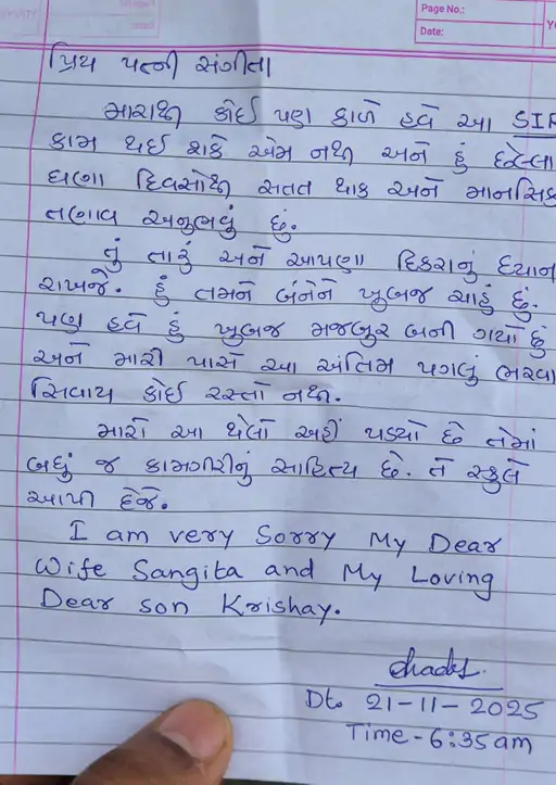 Gujarat : ગીર સોમનાથના કોડીનાર તાલુકાના છારા ગામે ફરજ બજાવતા BLO અને શિક્ષક અરવિંદ વાઢેર (40)એ SIR કામગીરીના સતત દબાણ અને માનસિક તણાવને કારણે આજે સવારે ફાંસો ખાઈ જીવન ટૂંકાવ્યું. તેમણે પોતાના વતન દેવળી ખાતે આત્મહત્યા કરી હતી. ઘટના પહેલા લખેલી સુસાઇડ નોટમાં અરવિંદભાઈએ સ્પષ્ટ લખ્યું છે કે તેઓ છેલ્લા ઘણા દિવસોથી સતત માનસિક થાક અને તણાવ અનુભવી રહ્યા હતા અને હવે આ કામગીરી તેમના માટે અસહ્ય બની ગઈ હતી. પરિવારને સંબોધીને તેમણે “તું તારું અને દીકરાનું ધ્યાન રાખજે. હવે મારી પાસે કોઈ રસ્તો નથી” જેવા હૃદયદ્રાવક શબ્દો લખ્યા હતા.
