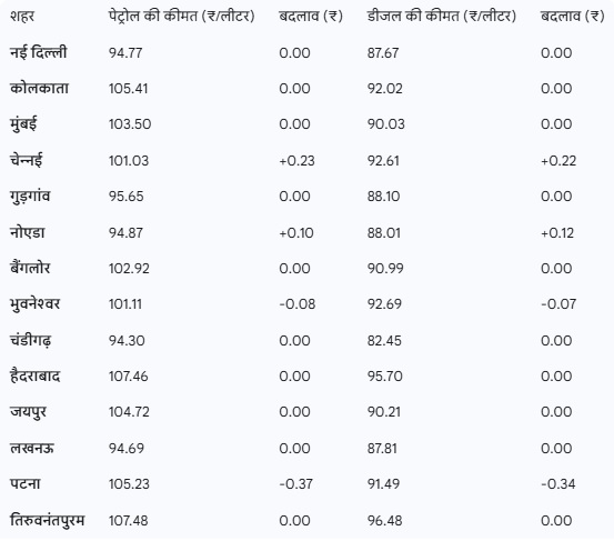 એ નોંધવું જોઈએ કે આજે ચેન્નાઈ અને નોઈડા જેવા કેટલાક શહેરોમાં પેટ્રોલ અને ડીઝલના ભાવમાં થોડો વધારો જોવા મળ્યો હતો, જ્યારે ભુવનેશ્વર અને પટનામાં થોડો ઘટાડો નોંધાયો હતો. અન્ય મુખ્ય શહેરોમાં ભાવ મોટાભાગે સ્થિર રહ્યા હતા.
