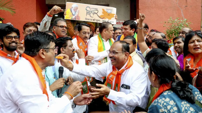 Politics News : બિહારના પટનામાં ભાજપના કાર્યકરોએ ખૂબ જ ઉત્સાહથી ઉજવણી કરી. ભાજપના નેતાઓ અને કાર્યકરોએ પાર્ટીનો ધ્વજ લહેરાવતા અને એકબીજાને મીઠાઈ ખવડાવતા જોવા મળ્યા. તેમણે પીએમ મોદી સહિત પાર્ટીના વરિષ્ઠ નેતાઓના સમર્થનમાં સૂત્રોચ્ચાર પણ કર્યા. બધા કાર્યકરો ખૂબ જ ખુશ દેખાયા.